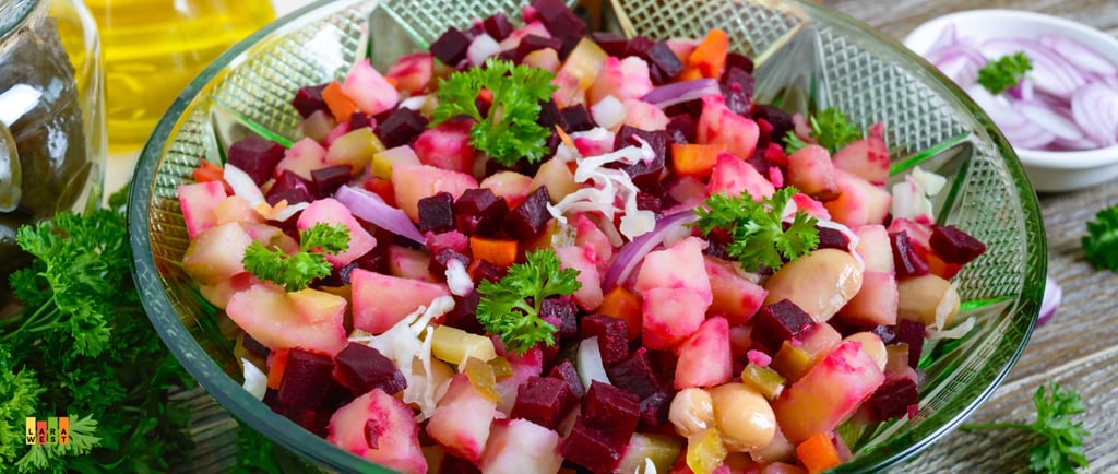 Steam or boil beets and carrots; bake or boil potatoes; cool down and peel them - or not! I always peel beets but not carrots and potatoes; cut beets, carrots, potatoes, pickles into small cubes. Peel the onion and chop very finely. Rinse canned beans. Combine all ingredients in a large bowl: potatoes, carrots, beets, pickles, onions, sauerkraut, beans; add pepper and olive oil and mix well. You can also add chopped dill and/or parsley.